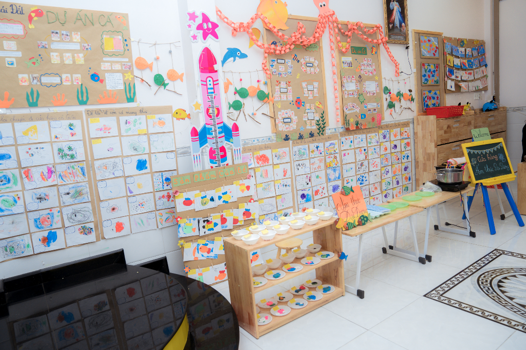 3. Môi trường lớp học được thiết kế nhẹ nhàng, phù hợp với từng độ tuổi của trẻ, môi trường được các cô giáo thay đổi liên tục theo dự án để luôn tạo sự mới mẻ cho trẻ khi đi học.